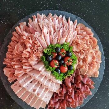 Fleischkäse, Salami, Rohfleisch, Schinken Garnitur und Brot Div. Weich- und Hartkäse garniert mit Brot